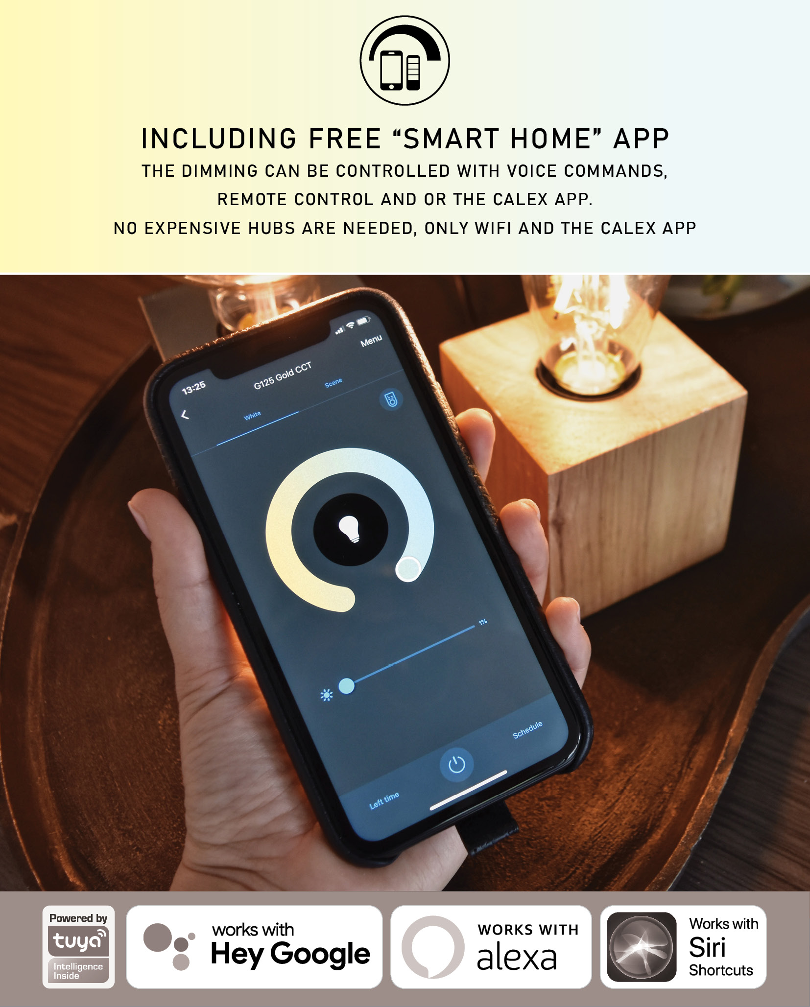 Deze lichtbron is speciaal geselecteerd vanwege zijn “Dim to warm” & “Smart home” techniek. Hierdoor zijn deze lampen te dimmen van zeer helder wit licht tot gezellig warm licht. Het dimmen is te bedienen met spraakcommando’s, afstandsbediening en of de Calex app. Er zijn geen dure hubs nodig, met alleen wifi en de Calex app kun je timers of routines instellen voor elk denkbaar scenario.
